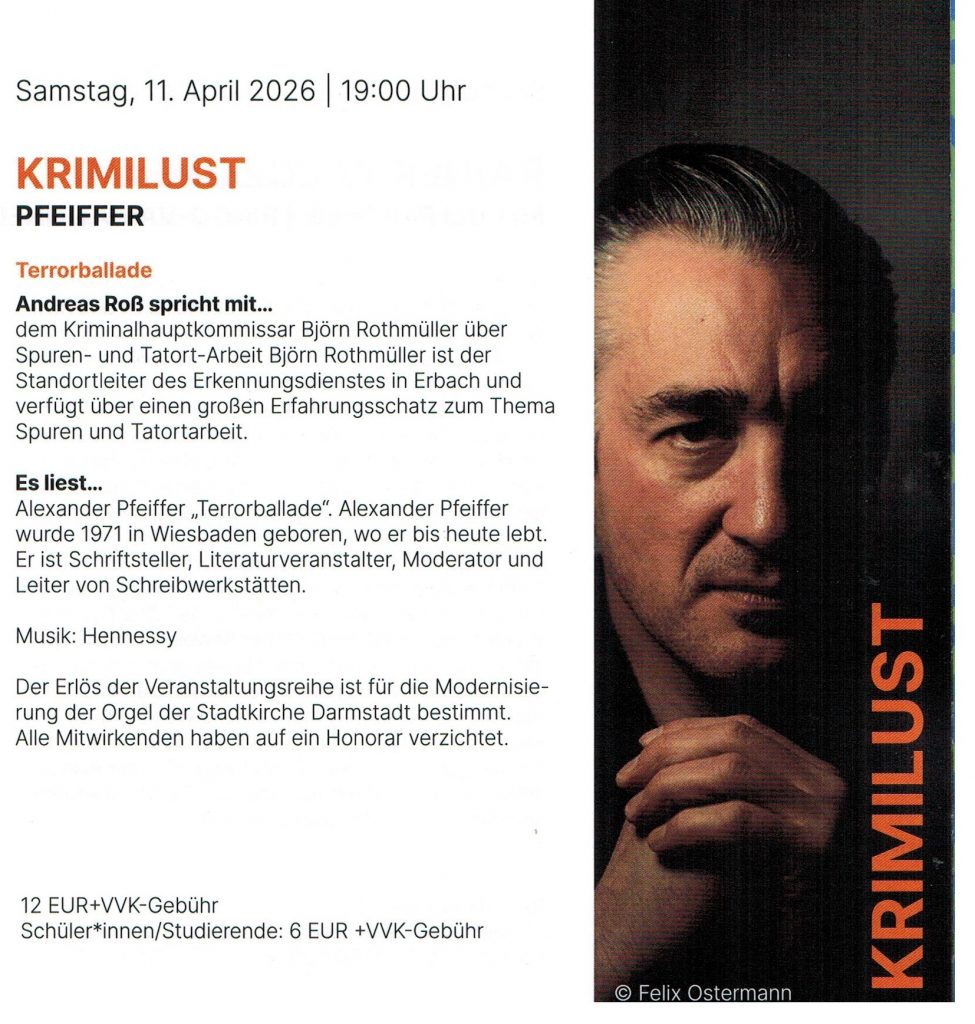 Mit der „Darmstädter Krimilust“ bringt Andreas Roß regelmäßig Krimilesungen und Gespräche über Kriminalität und Straftaten in die Evangelische Stadtkirche Darmstadt. Der Erlös der Veranstaltungsreihe ist für die Modernisierung der Kirchenorgel bestimmt. Am Samstag, den 11. April 2026, lese ich als Teil der Reihe aus meinem aktuellen Roman „Terrorballade“.